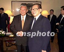 國家主席江澤民五月九日出席香港特區(qū)行政長官董建華舉辦的午宴上與董先生親切握手。中新社傳真 任海霞 攝