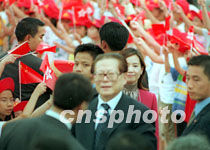 國家主席江澤民9日結束訪問香港,一百五十名學生在機場歡送。 中新社傳真 盧峰 攝