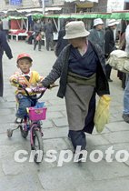 西藏拉薩的一位藏族小朋友騎著小自行車上街,與母親傳統(tǒng)的藏裝相比,他的裝備無疑是現(xiàn)代了許多。中新社記者 滿會喬 攝