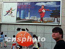 北京王府井新華書店新近掛起巨幅申奧宣傳牌,進一步表現(xiàn)出北京對成功申辦2008年奧運會的激情與信心。中新社圖 呂宗杰 攝