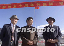 多彩西藏:布達拉宮前看升旗(圖文) 2001年5月24日 06:48 ![]() 中國西藏拉薩布達拉宮廣場二十三日舉行隆重的升旗儀式,慶祝西藏和平解放五十周年。中新社記者 滿會喬 攝 ![]() 全國人大常委會副委員長、西藏自治區政協主席帕巴拉·格列朗杰(中),自治區黨委常務副書記、自治區人大主任熱地(右)等出席了在拉薩布達拉宮廣場舉行的“升國旗·唱國歌”儀式。中新社記者 滿會喬 攝