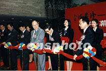 紀念西藏和平解放五十周年——《雪域珍藏——西藏文物精華展》二十六日在上海博物館開幕。上海市委書記黃菊(前右二)、市長徐匡迪(前右三)及西藏自治區主席列確(前右一)為展覽剪彩。中新社圖 姜煜 攝