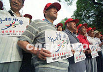解放軍總參通信部退休老戰(zhàn)士二十八日佩帶“申奧”標(biāo)志在北京西郊列隊(duì),準(zhǔn)備舉行蹬山活動(dòng),支持北京“申奧”成功。中新社記者 宋吉河 攝