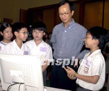 香港財政司司長梁錦松周六上午一身便裝出席香港優秀電腦網頁設計比賽頒獎典禮時,欣賞由十二歲少年蔡悅剛(右一)設計的網頁。中新社傳真任晨鳴攝