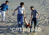 圖文:申奧“萬里行”將士挑戰(zhàn)敦煌鳴沙山極限 2001年6月13日 09:38 ![]() “萬里行”鳳凰車隊在敦煌鳴沙山挑戰(zhàn)極限。圖為將士們登頂后從沙山上順坡而下,齊聲呼喊。魏孝明 攝 ![]() 鳳凰衛(wèi)視編導(dǎo)李哲小姐雖發(fā)揚“不怕苦不怕累”的精神,但終因體力不支,在沙坡上累倒了。圖為隊友把她從坡上“拖”下來的情景。魏孝明 攝