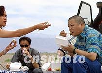 著名歌星臧天朔將隨"萬里行"車隊遠征邊疆。圖為6月14日他與隊友們在經哈密途中一起“野餐”。中新社圖 魏孝明 攝