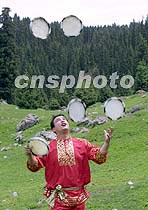 哈薩克藝人表演民族雜技,五個手鼓在空中飛舞,形如五環交疊,預祝北京好運。中新社圖 魏孝明 攝