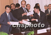 ![]() 參加中日貿易問題談判的日方人員三日下午在北京外經貿部談判大樓參加中日貿易問題的正式磋商時,臨時調整自己的坐次。中新社記者 鄒憲 攝