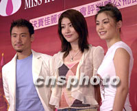 歌星張學友、陳慧琳及應屆華裔小姐廖碧兒11日在香港出席港姐決賽十二位佳麗會晤大會評判記者會,他們將于15日晚舉行的決賽為大會作表演嘉賓。中新社圖 鄧慶樂 攝