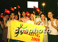 組圖:申奧之夜激情飛揚 2001年07月13日 23:45 ![]() 十三日晚,福建省各界青年來到福州五一廣場高舉北京2008年申奧旗幟,滿懷激情歡呼北京申奧成功。中新社圖 劉可耕 攝 ![]() 手舉中國國旗和申奧標志的游客十三日下午在青島五四廣場上齊聲高呼:相約北京,揚帆青島。作為協辦城市,青島正積極地為申奧工作做最后的準備。中新社記者 鄭萍萍 攝