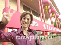 歌星解曉東臉上畫著五星紅旗圖案,在中國駐莫斯科大使館歡呼北京申辦二00八年奧運會成功。中新社記者 賈國榮 攝