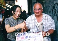 一位名叫麥克的美國人(右)在紐約街頭向派送“號外”的華裔少婦季小姐祝賀北京贏得奧運主辦權。中新社記者 郭健 攝