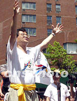 組圖:紐約華人愿中國給世界一個奇跡 2001年07月16日 13:56 ![]() 七月十五日中午,紐約的花俊雄先生穿起八年前北京首次申奧時穿過的T恤衫,參加美東地區慶祝北京申奧成功大會。他說:“我們終于勝利啦!世界給了中國一個機會,七年后,中國會給世界一個奇跡。中新社記者 陳建 攝 ![]() 美東地區僑學界七月十五日在紐約華埠集會,歡慶北京申奧成功。當臺上的女歌唱家高歌《我愛你,中國》時,一位華裔女青年情不自禁地跟著吟唱起來。中新社記者 郭健 攝