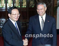組圖:中國外長唐家璇與美國國務卿鮑威爾會談 2001年07月28日 10:13 ![]() 中國外交部長唐家璇二十八日在北京釣魚臺國賓館會見美國國務卿鮑威爾。中新社記者 滿會喬 攝 ![]() 中國外交部長唐家璇與美國國務卿鮑威爾二十八日在北京釣魚臺國賓館舉行會談。中新社記者 毛建軍 攝