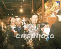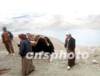 組圖:八月的西藏 2001年08月14日 16:50 ![]() 八月是西藏旅游的黃金季節,藏民牽著牦牛在美麗的羊卓雍湖邊迎候游人,他們以為游客提供照相服務而增加自己的收入。中新社記者 滿會喬 攝 ![]() 八月的西藏拉薩,前往大昭寺朝拜釋迦牟尼佛像的藏民絡繹不絕。相傳這里供奉的釋迦牟尼佛像為唐朝初年文成公主帶入西藏。中新社記者 滿會喬 攝