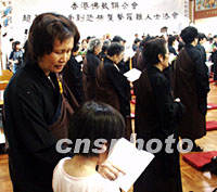 圖文:香港佛聯(lián)舉行法會超度“九一一”罹難者 2001年09月16日 01:09 ![]() 香港佛教聯(lián)合會15日下午為美國「九一一事件」罹難者舉辦的超度法會上,一對母子一起誦讀《心經》,祈祝世界和平。中新社圖 董會峰 攝