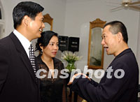 ![]() 澳門政府4日邀請香港巨星周潤發(fā)出席"第十五屆澳門國際音樂節(jié)"中的臥虎藏龍音樂會,澳門文化局局長何麗鉆向發(fā)仔贈送紀(jì)念品。中新社圖 任晨鳴 攝 ![]() 專程到澳門出席 "第十五屆澳門國際音樂節(jié)"臥虎藏龍音樂會的香港巨星周潤發(fā)和夫人,4日與奧斯卡金像獎得主、著名指揮家譚盾在澳門喜相逢。中新社圖 任晨鳴 攝