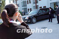 一名上海姑娘十九日在中美領導人會談場外被布什總統的座駕所吸引,拿起相機拍照留念。中新社記者 賈國榮 攝