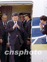 泰國總理他信(左二)十九日中午十三時到達上海浦東機場,他將參加二十一日的APEC領導人非正式會議。中新社圖 劉殊瑾 攝