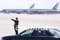 一名警察在上海浦東機場指揮車隊,他的身后是美國“空軍一號”專機。中新社圖 劉殊瑾 攝