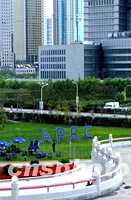 上海浦東高樓大廈畔的綠茵中,設有APEC花園,中外記者在新聞拼搏之余都愛來此享受片刻溫馨。中新社記者 賈國榮 攝
