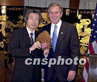 組圖:布什會見小泉純一郎 2001年10月20日 16:10 ![]() 10月20日,美國總統布什(右)在上海下榻的酒店會見日本首相小泉純一郎。圖為布什向小泉贈送棒球手套。中新社圖 ![]() 10月20日,美國總統布什在下榻的酒店會見日本首相小泉純一郎。圖為小泉純一郎(左)向布什贈送禮品。中新社圖