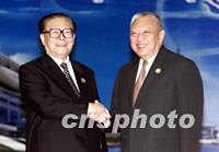 10月20日,中國國家主席江澤民在上海國際會議中心迎接中國香港特別行政區行政長官董建華。中新社圖