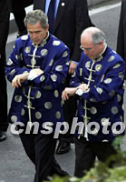 10月21日,出席亞太經合組織領導人非正式會議的澳大利亞總理霍華德與美國總統布什不約而同看時間。中新社圖
