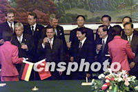 ![]() 國(guó)務(wù)院總理朱镕基與德國(guó)總理施羅德三十一日在北京共同出席中德雙方合作協(xié)議的簽字儀式。中新社記者 滿會(huì)喬 攝 |