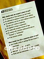 本網特稿:奪命孢子牽動美國“神經”(附圖) 2001年11月05日 15:02 ![]() 十余例由信件引起的炭疽病菌感染已造成美國民眾的恐慌心理,美國郵政總局局長波特向全美一億四千七百多個郵件地址發出明信片,它提醒民眾小心處理郵件。該圖是明信片的背面,它告誡人們哪些郵件值得懷疑;如何處理有懷疑的郵件。中新社 徐德金 攝 ![]() 1998年挪威的特隆郝姆警察博物館館長發現了一塵封已久的玻璃瓶,標簽上寫著“一塊糖中藏有炭疽菌--1917年Otto Karl von Rosen男爵作為間諜嫌疑時從他的行李中發現的”。英國科學家與挪威微生物科學家檢測證實,它是恐怖的B型炭疽。顧建文攝