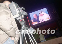 午夜時分,北京火車站站前廣場電視大屏幕前,媒體記者和市民一起等候中國入世新聞。中新社圖 張勤 攝
