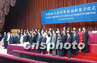 中新社記者卡塔爾特寫:今宵多歡樂(附圖) 2001年11月12日 02:42 ![]() 中國加入WTO簽字儀式于北京時間12日凌晨在多哈舉行,圖為簽字現場。中新社記者 錢興強 攝 ![]() 石廣生部長于北京時間12日在多哈簽署中國入世議定書后,在會場橫幅上簽名留念,記錄下這一歷史時刻。中新社記者 錢興強 攝