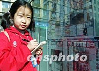 北京九歲學童軒軻,十一日在報欄前記下中國入世的新聞,她將把它作為素材寫進日記。中新社圖 劉殊瑾 攝