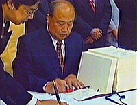 石廣生:加入WTO為兩岸發展經貿關系提供新機遇 2001年11月12日 18:50 ![]() 中國代表團團長石廣生于當地時間11日晚在多哈簽署中國入世議定書。中新社記者 錢興強 攝 ![]() 中國代表團團長石廣生于北京時間十二日零點許在卡塔爾首都多哈喜來登飯店簽署中國加入世貿組織議定書。中新社圖