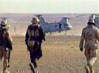 三名美國特種部隊士兵四日走向坎大哈南部美軍基地的直升飛機。美軍日前正加強在坎大哈的軍事部署,但仍沒有地面部隊直接參與攻打坎大哈的進攻。