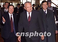 董建華抵達北京述職 將與江澤民等領(lǐng)導(dǎo)人會面 2001年12月19日 13:04 ![]() 前來北京述職的香港特別行政區(qū)行政長官董建華十九日中午抵達北京港澳中心并接受記者訪問時說:“為香港真正做點事是我的目標”。中新社記者 毛建軍 攝 ![]() 前來北京述職的香港特別行政區(qū)行政長官董建華十九日中午抵達下榻的北京港澳中心,受到國務(wù)院港澳辦公室副主任陳佐洱(左一)等人的迎接。中新社記者 毛建軍 攝
