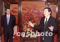 中國國務(wù)院總理朱镕基二十六日在北京中南海會見前來述職的澳門特別行政區(qū)行政長官何厚鏵。中新社記者 毛建軍 攝