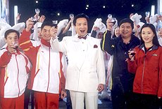 歌星、體育明星在央視春節晚會節目中演唱《舉杯吧、朋友》,以此慶賀中國申奧成功、足球沖入世界杯連連喜事。中新社圖