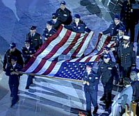 圖:第十九屆冬季奧運會在美國鹽湖城開幕 2002年02月09日 17:17 ![]() 紐約世貿中心廢墟里挖出的殘破的美國國旗,在運動員、消防隊員和警察護送下,進入第十九屆美國鹽湖城冬季奧運會開幕式會場。第十九屆冬季奧運會二月八日(當地時間)在美國鹽湖城開幕。
