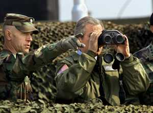 布什視察都羅山車站 稱南北鐵路是和平之路(圖) 2002年02月20日 14:41 ![]() 布什在非軍事區(qū)用望遠(yuǎn)鏡觀望朝鮮一側(cè)(美聯(lián)社) 中新網(wǎng)北京2月20日消息:韓國總統(tǒng)金大中和來訪的美國總統(tǒng)布什今天視察都羅山車站。這個(gè)車站是金大中希望連接平壤和漢城的鐵路線的北終點(diǎn)站。 據(jù)韓國聯(lián)合新聞社報(bào)道,金大中希望借此舉來敦促朝鮮對(duì)恢復(fù)對(duì)話的呼吁作出回應(yīng)。 在上午的首腦會(huì)談中,兩國總統(tǒng)就聽取了這項(xiàng)連接南北的鐵路工程的進(jìn)度情況簡報(bào)。 在舉行聯(lián)合記者招待會(huì)后,布什乘直升飛機(jī)花費(fèi)二十分鐘抵達(dá)非軍事區(qū)。這個(gè)二點(diǎn)五英里寬,一百五十一英里長的區(qū)域布滿地雷,分界線兩側(cè)駐扎著將近朝韓兩百萬軍隊(duì)。 美國在韓國保持有三萬七千人的駐軍。布什在抵達(dá)時(shí)向一名指揮官威廉·米勒中校敬禮致意。 布什在都羅山車站發(fā)表講話。他說:“我們今天相聚在這里,周圍是朝鮮半島和平與穩(wěn)定受到挑戰(zhàn)時(shí)的遺跡。金大中總統(tǒng)剛才向我介紹了一條他修建的道路--一條和平之路。” 據(jù)路透社報(bào)道,布什敦促朝鮮對(duì)韓國開放邊境。他說:“這條鐵路可能將這塊分裂的土地兩側(cè)的人民帶到一起來。為了朝鮮半島全體人民的福祉,朝鮮應(yīng)該完成它。” 布什在非軍事區(qū)的講話強(qiáng)硬的措詞中也顯示出靈活性。他甚至在談及朝鮮時(shí)仍使用了“邪惡”這個(gè)字眼,但他同時(shí)也重申了朝鮮對(duì)話的建議。 在一個(gè)觀察哨所里,布什身穿一件手臂上繡有美國國旗的綠色軍用夾克,通過雙筒望遠(yuǎn)鏡從壘著沙袋的地堡內(nèi)觀察朝鮮一側(cè)。