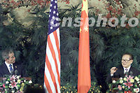 中新社北京二月二十一日十三時十五分電 本社記者譚宏偉現場報道:今天下午,中國國家主席江澤民和美國總統布什在結束大約一小時四十分鐘的會談后來到人民大會堂中央大廳共同會見記者。 江澤民說,在今天的會談中,我與布什總統回顧了中美關系三十年的歷程,深入討論了雙邊關系和當前國際形勢,達成了許多重要共識,取得了多方面的積極成果。 兩國元首將在預計三十分鐘的時間里,向早已等候在這里的三百多名中外記者介紹此次峰會的主要內容并回答有關提問。記者會現正在進行當中。