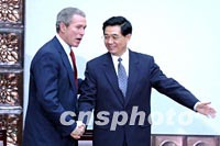 圖:國家副主席胡錦濤與美國總統布什握手告別 2002年02月22日 19:52 ![]() 中國國家副主席胡錦濤二十二日在北京清華大學與美國總統布什握手告別。中新社記者 賈國榮 攝