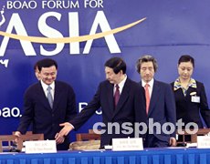 圖:朱镕基與各國領導人一起出席博鰲開幕式 2002年04月12日 12:31 ![]() 博鰲亞洲論壇首屆年會十二上午在海南博鰲開幕,國務院總理朱镕基、日本首相小泉純一郎、泰國總理他信(左一)出席開幕式。中新社圖 滿會喬 攝