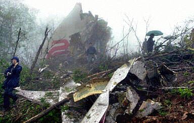 圖:失事飛機部分殘骸上依稀可見國航標志 2002年04月15日 16:10 ![]() 中國國際航空公司一架波音七六七型飛機十五日從北京起飛于韓國墜毀。圖為失事飛機墜落爆炸后的部分殘骸上依稀可見國航標志。法新圖