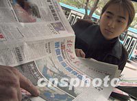 圖:北京市民關(guān)注國(guó)航客機(jī)墜機(jī)事件 2002年04月15日 16:50 ![]() 一位北京市民十五日下午正在街頭報(bào)亭購(gòu)買(mǎi)當(dāng)日晚報(bào),了解中國(guó)國(guó)際航空公司一架波音767客機(jī)在韓國(guó)釜山機(jī)場(chǎng)附近墜毀的相關(guān)消息。中新社記者 張勤 攝