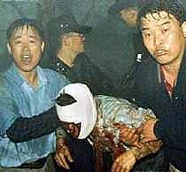 圖:滿身鮮血纏滿繃帶的乘客被送往醫院 2002年04月15日 17:21 ![]() ![]() 在韓國釜山附近金海機場撞山墜毀的中國航班上至少有54名生還者。圖為數名滿身鮮血和纏滿繃帶的乘客被救援人員背著送往醫院。直升機和救援車輛無法進入現場。