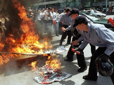 圖:韓國民間團體集會抗議日本首相靖國參拜 2002年04月22日 17:16 韓國在日本戰(zhàn)爭中的受害者,強烈抗議日本首相小泉純一郎參拜靖國神社。圖為在漢城韓國警察試圖熄滅抗議者燃燒的日本旗幟。法新圖