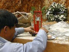 ![]() 在耶路撒冷爆炸中喪生的中國工人蔡獻陽和林春美的遺體25日晚運抵福建莆田死難者所在的村子,并分別于26日上午8時和下午1時在家人和親友的安排下各自舉行了遺體的安葬儀式。