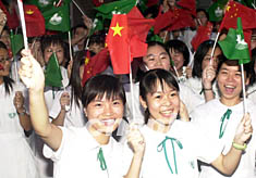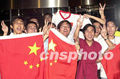 圖:澳門學生歡迎中國國家足球隊 2002年05月24日 19:12 ![]() 澳門教業高二的一百名學生23日晚高舉中國國旗和澳門特區區旗,歡迎中國國家足球隊的到來。中新社記者 李剛 攝