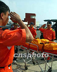 圖:臺灣搜救人員向空難遺體敬禮 2002年05月27日 11:31 ![]() 臺灣搜救人員向華航空難海域撈回的遇難者遺體敬禮致哀。中央社攝/中新社